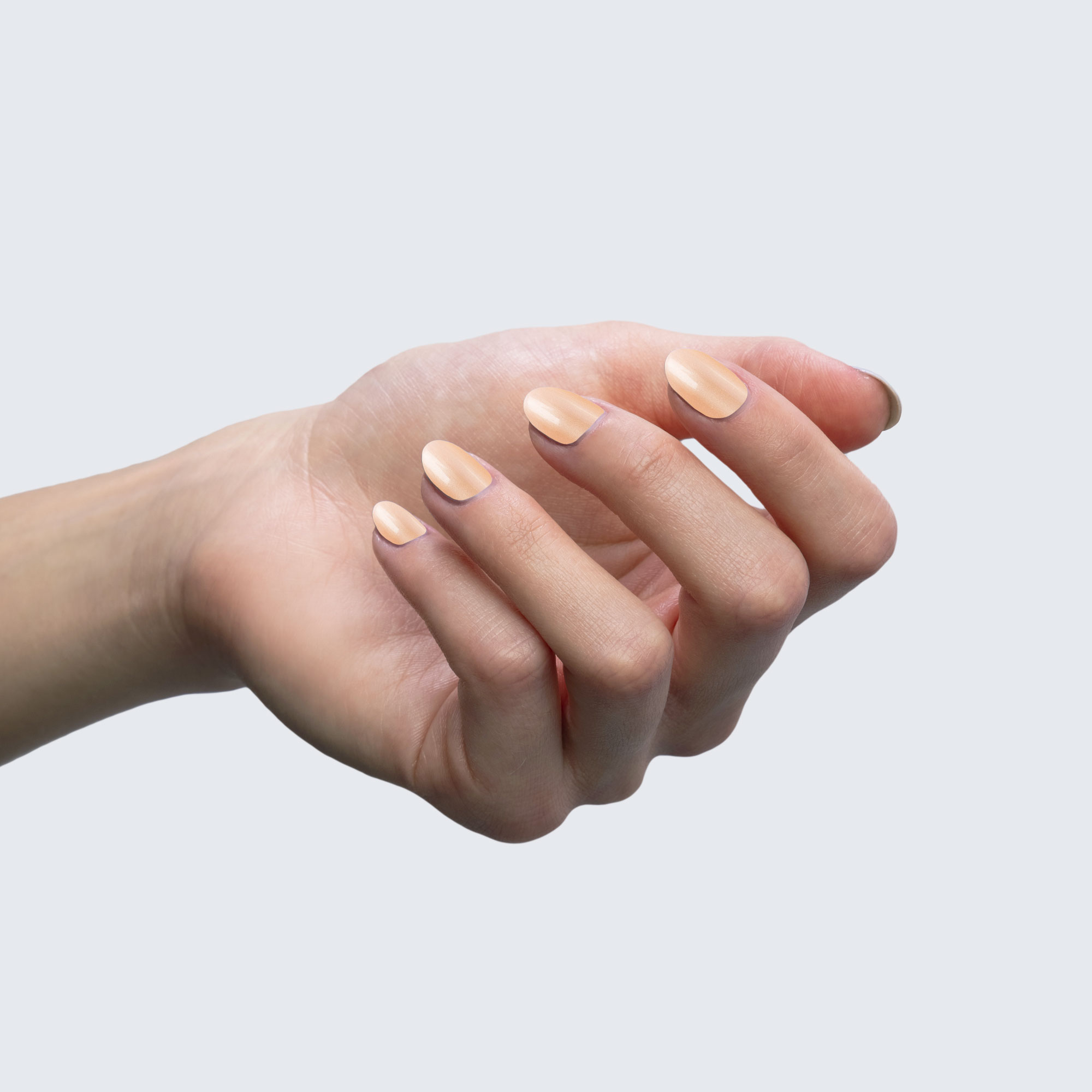 Peachy orange. Pastel. Pearl finish. Opaque. Cool undertone.